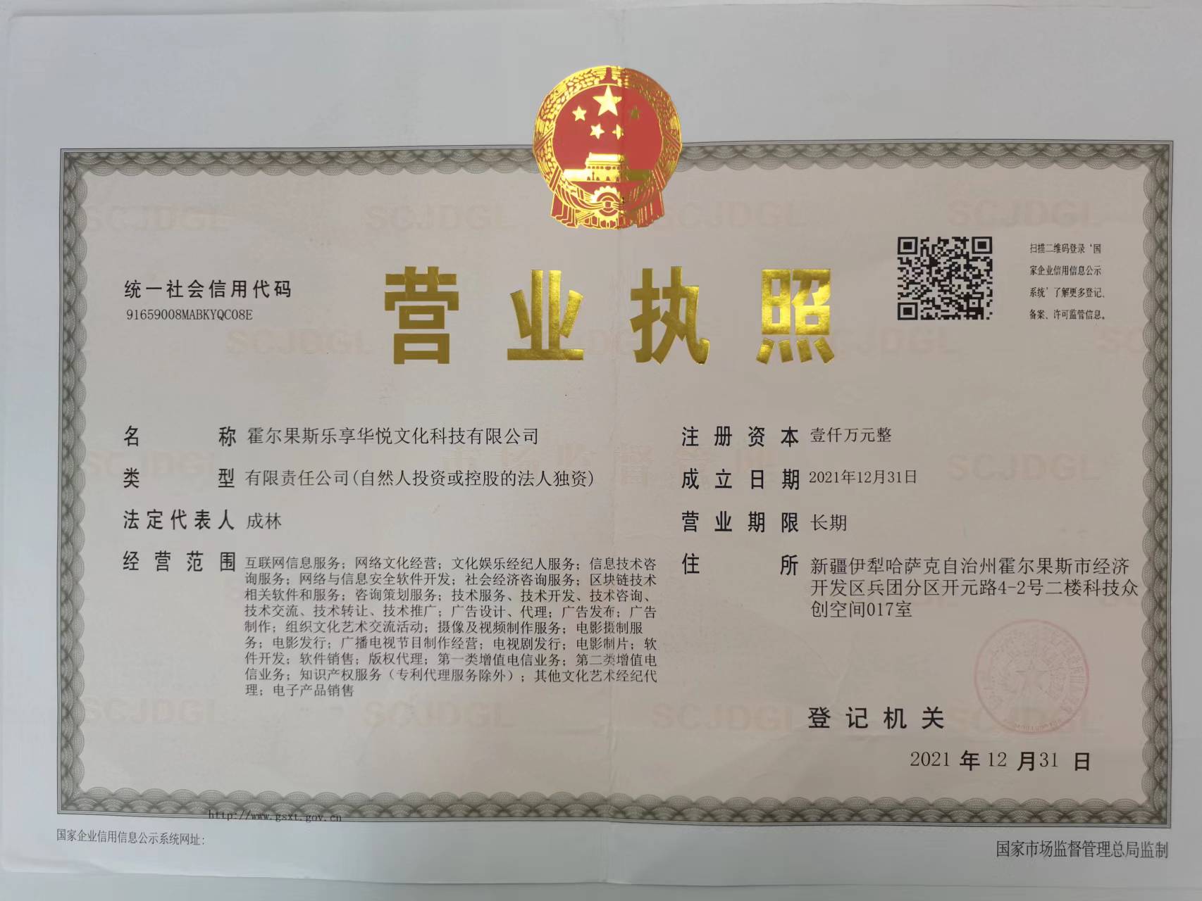 霍尔乐享华悦文化科技有限公司(下称“乐享华悦”)成立于2021年12月31日,是北京乐享互动网络科技股份有限公司的全资子公司,注册资本为:1000万元人民币;统一社会信用代码为:91659008MABKYQC08E;法定代表人为:成林;注册地址为:新疆伊犁哈萨克自治州霍尔果斯市经济开发区兵团分区开元路4-2号二楼科技众创空间017室 。